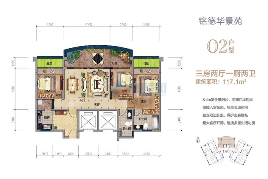 02户型-建面约117.1-3室2厅2卫(建筑面积:117.1㎡)