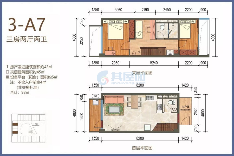 3-A7户型-建面约43㎡-3室2厅2卫1厨(建筑面积:43㎡)