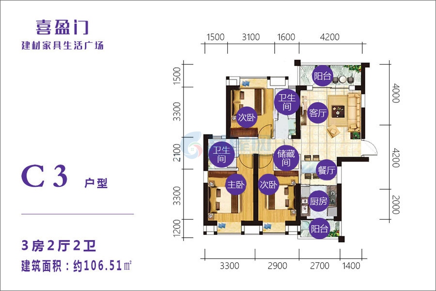 C3户型-建面约106.51㎡-3房2厅2卫(建筑面积:106.51㎡)