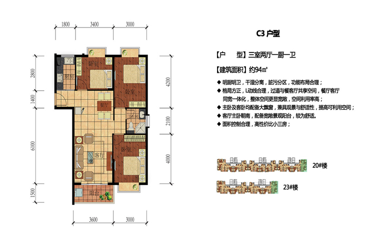 94平米三房两厅(建筑面积:97㎡)