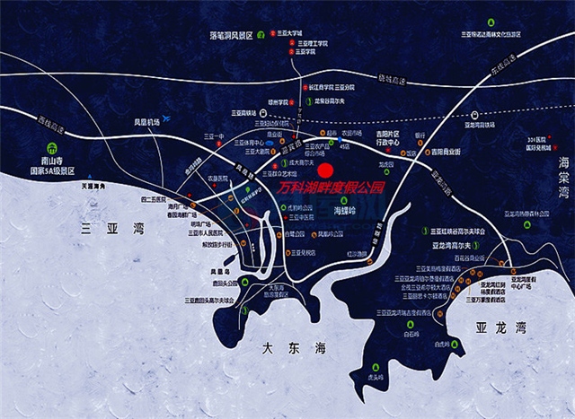 万科湖畔度假公园位于三亚市吉阳区迎宾路中段,紧邻三亚城市主干道迎宾路;在这城市轻轨上,入住社区后,如果想到周边城市和地区游玩,可以通过绕城高速过东线或西线高速线路,亦可从六公里外的亚龙湾站乘动车出行,非常方便、快捷、安全