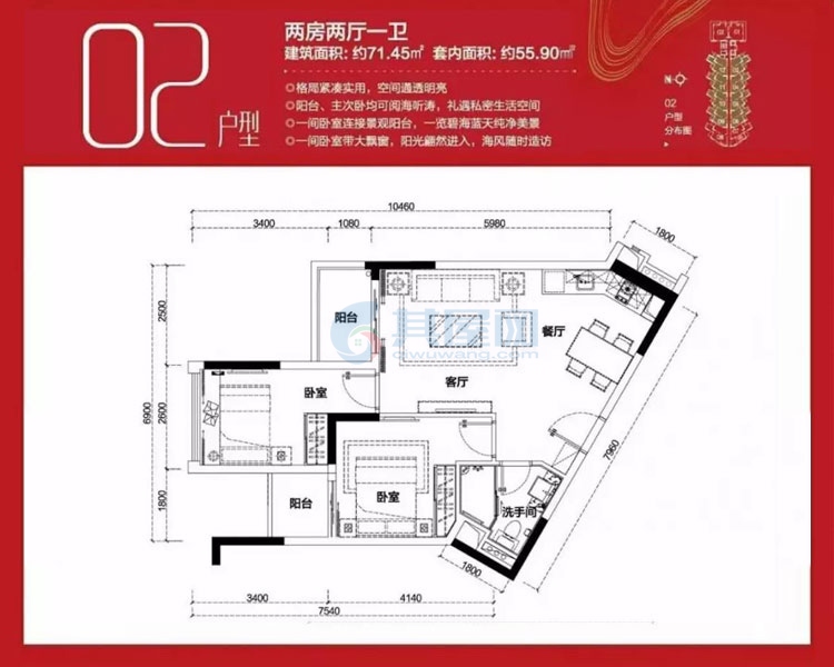 02户型约71.45平米(建筑面积)两房两厅(建筑面积:71.45㎡)