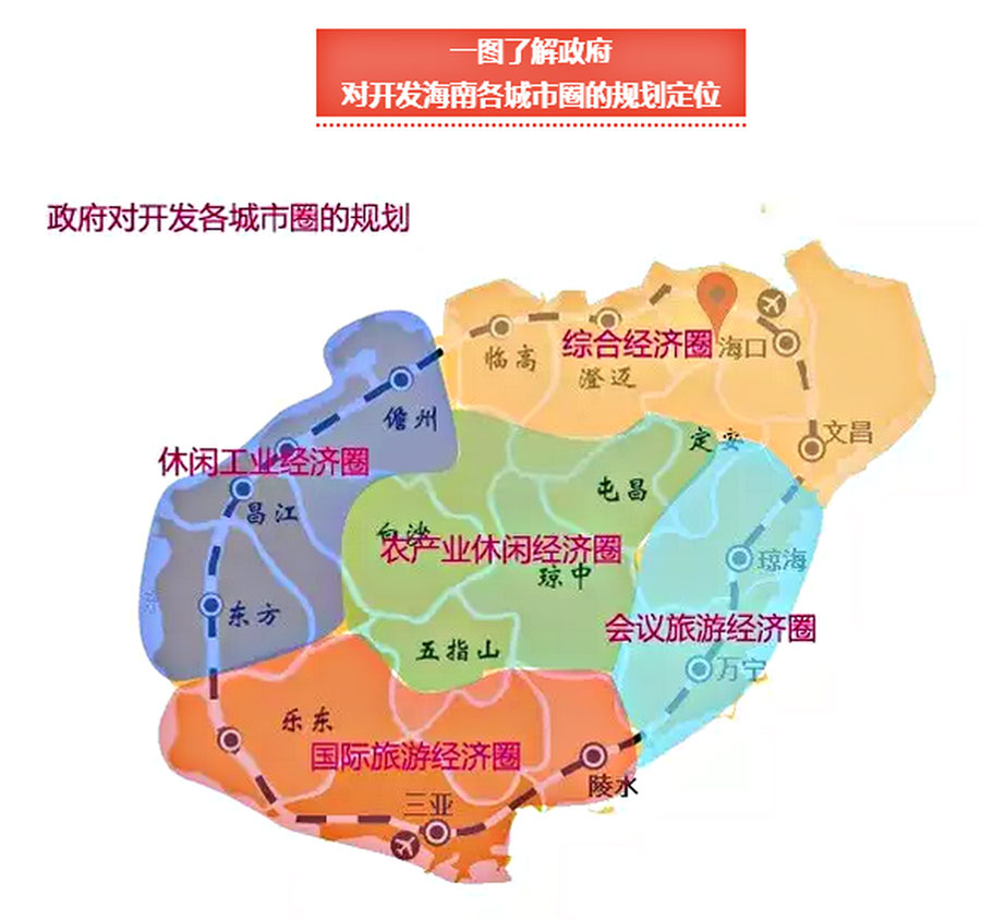 目前,根据海南经济发展类型划分为五个经济圈:综合经济圈、休闲工业经济圈、农产业休闲经济圈、会议旅游经济圈、国际旅游经济圈。